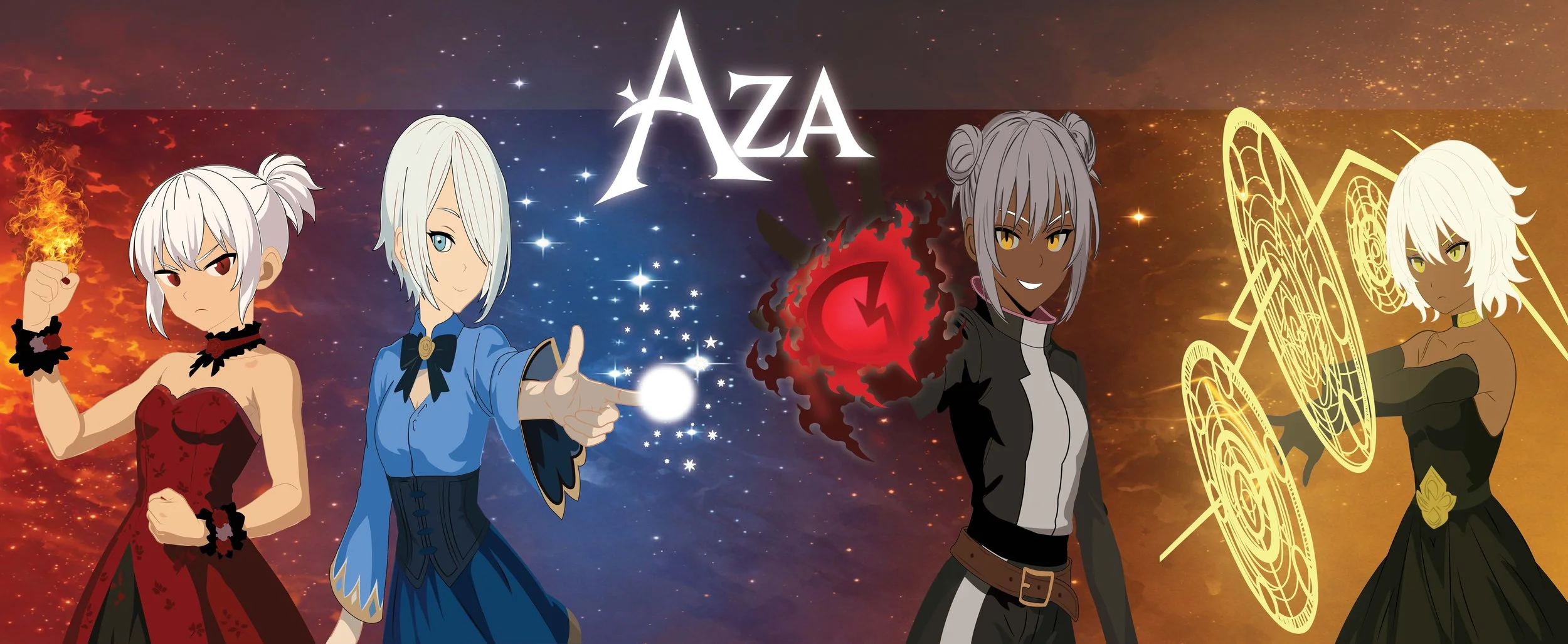 The character illustrations for AZA were designed to visually communicate each character’s elemental abilities and role within the game. Color, lighting, and pose were used intentionally to reinforce gameplay mechanics, with clear silhouettes and dynamic action stances for readability in both in-game and promotional contexts. Each illustration balances personality and power, ensuring the characters feel distinct while remaining visually cohesive within the game’s world.
