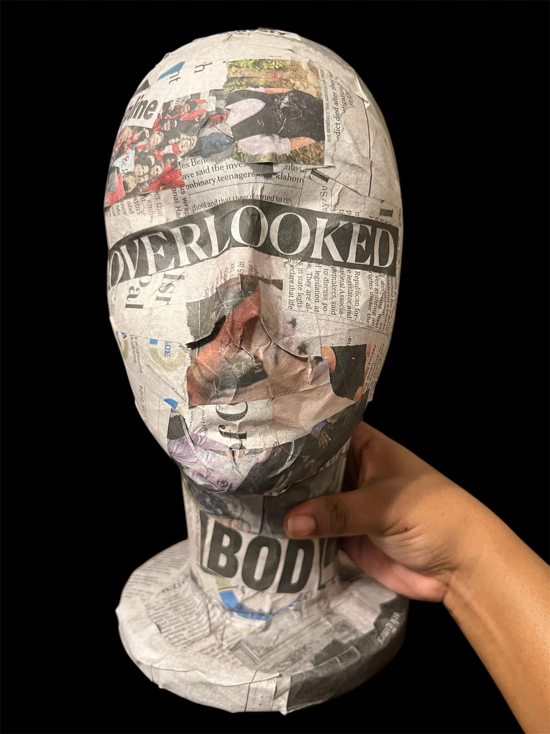 The sculpture itself is layered with meaning: a head wrapped in newspaper clippings, symbolizing the overwhelming weight of societal narratives and expectations. The pink tears streaming down its face speak to the pain and sadness of navigating these imposed roles, much like the frustration conveyed in Nixon’s voice as she recounts the endless list of “rules.” The word “OVERLOOKED” across the eyes represents the invisibility women often feel when their true selves are obscured by these stereotypes. A choker constructed from heavy chains emphasizes restriction and suffocation, paralleling the metaphorical chains described in the video’s narrative. Finally, the pastel flowers around the base juxtapose beauty and fragility, a reminder of how society demands women embody perfection while ignoring their struggles.